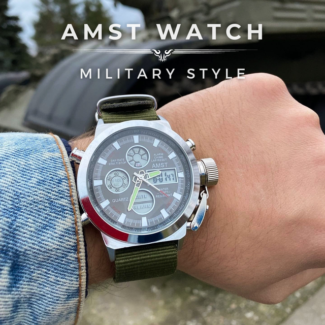 Наручний годинник AMST є відмінним зразком точної військової техніки. Це годинник з комбінованим зображенням часу. На одному циферблаті показує час звичним стрілковим способом та на LED дисплеї. Стрілки годинника покриті люмінесцентною фарбою, що дозволяє безпомилково визначати час навіть уночі. Крім того, модель має великий попит серед військових і бійців ЗСУ.